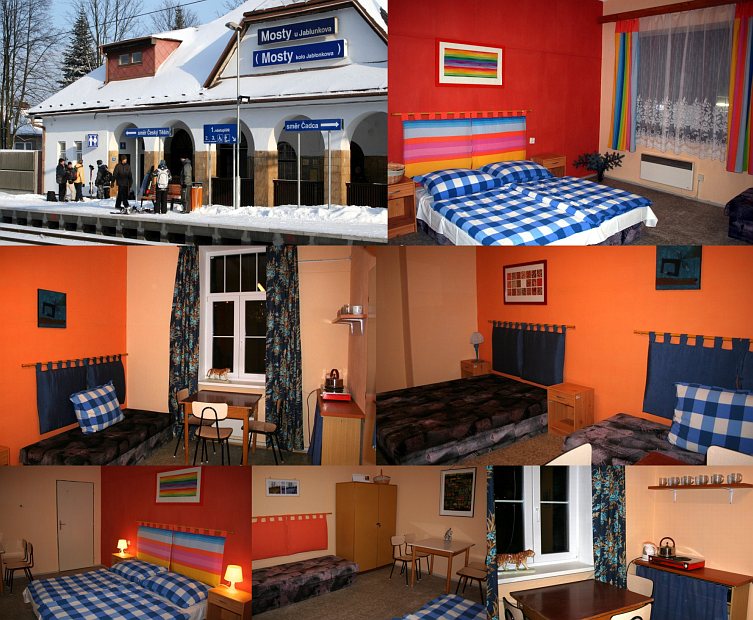 Umiestnenie: V budově beskydského vlakového nádraží Mosty u Jablunkova, vedle je obchod a restaurace. 750 m lyžařský areál Mosty u Jablunkova s několika sjezdovkami (uměle zasněžovanými), upravovanými běžkařskými trasami, bobovou dráhou, lanovým centrem, lezeckou stěnou, trampolínami a dalšími atrakcemi. Letní bazén 500 m.