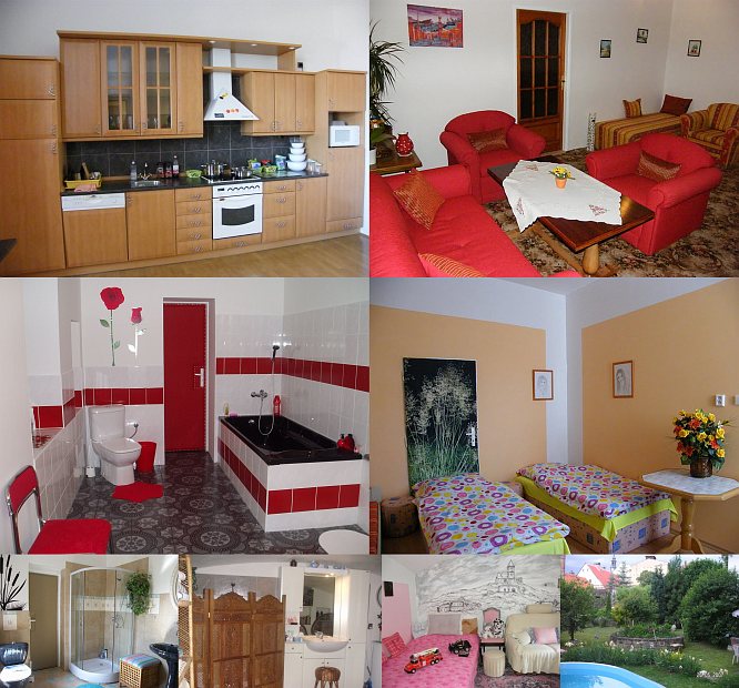 Ubytovanie: Pět apartmánů. Apartmán 1 (8 osob): 3 pokoje, sprcha a WC, kuchyňka (nádobí, vařič, lednička). Apartmán 2 (4 osoby): pokoj, sprcha a WC, kuchyňka (nádobí, vařič, lednička), internet. Apartmán 3 (6 osob): pokoj, kuchyň (nádobí, indukční vařič, mikrovlnka, lednička s mrazničkou), sprcha a WC, internet. Apartmán 4 (8 osob + přistýlka): 2 pokoje, kuchyň (nádobí, myčka, sporák se sklokeramickou deskou, mikrovlnka, lednička s mrazničkou), koupelna s vanou, WC, internet, DVD. Apartmán 5 (6 osob + 4 přistýlky): chalupářský styl, 3 pokoje, dětský pokoj, spol. místnost (bar, vnitřní krb), kuchyň (nádobí, sporák se sklokeramickou deskou, mikrovlnka, lednička), koupelna (rohová vana, pračka), zahrada (bazén, krb, gril).