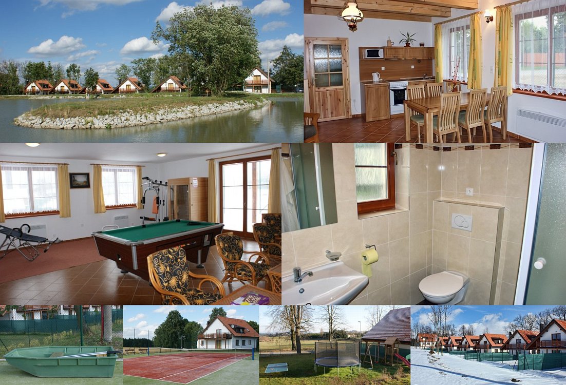 Ubytovanie: Kemp (chatová osada) se sedmi 6-lůžkovými chatami, v roce 2010 nově vystavěnými. Každá chata má na patře 2 pokoje (4+2 lůžka, 2 stolky, 4 křesla), koupelnu, balkon, v přízemí předsíň, koupelnu, kuchyňský kout (nádobí, sporák, lednice, konvice, mikrovlnka), obývací pokoj (sedací souprava, stolek, TV, krb+topivo), bezplatný internet. Venkovní posezení (gril). Parkování pro 2 auta u každé chaty. Pro hosty zdarma sportovní rybaření v rybníku Žlibečník, půjčení loďky (zdarma), tenisové (multifunkční) hřiště, dětský koutek s hřištěm, trampolínou a stolním tenisem. Za poplatek využití spol. místnosti (kulečník, infrasauna, malé fitness). Kemp je v provozu po celý rok.