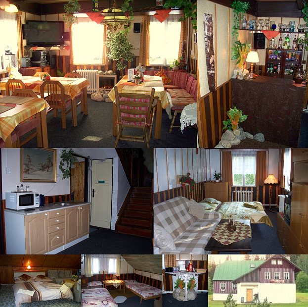 Ubytovanie: Typická krkonošská chalupa upravená na penzion s 2- až 5-lůžkovými pokoji. Společná kuchyň a společenská místnost (TV+SAT, video), prostor pro odkládání lyží, společné soc. zařízení. V chatě je vlastní restaurace. Před chatou je ohniště, gril, posezení (zahradní nábytek).