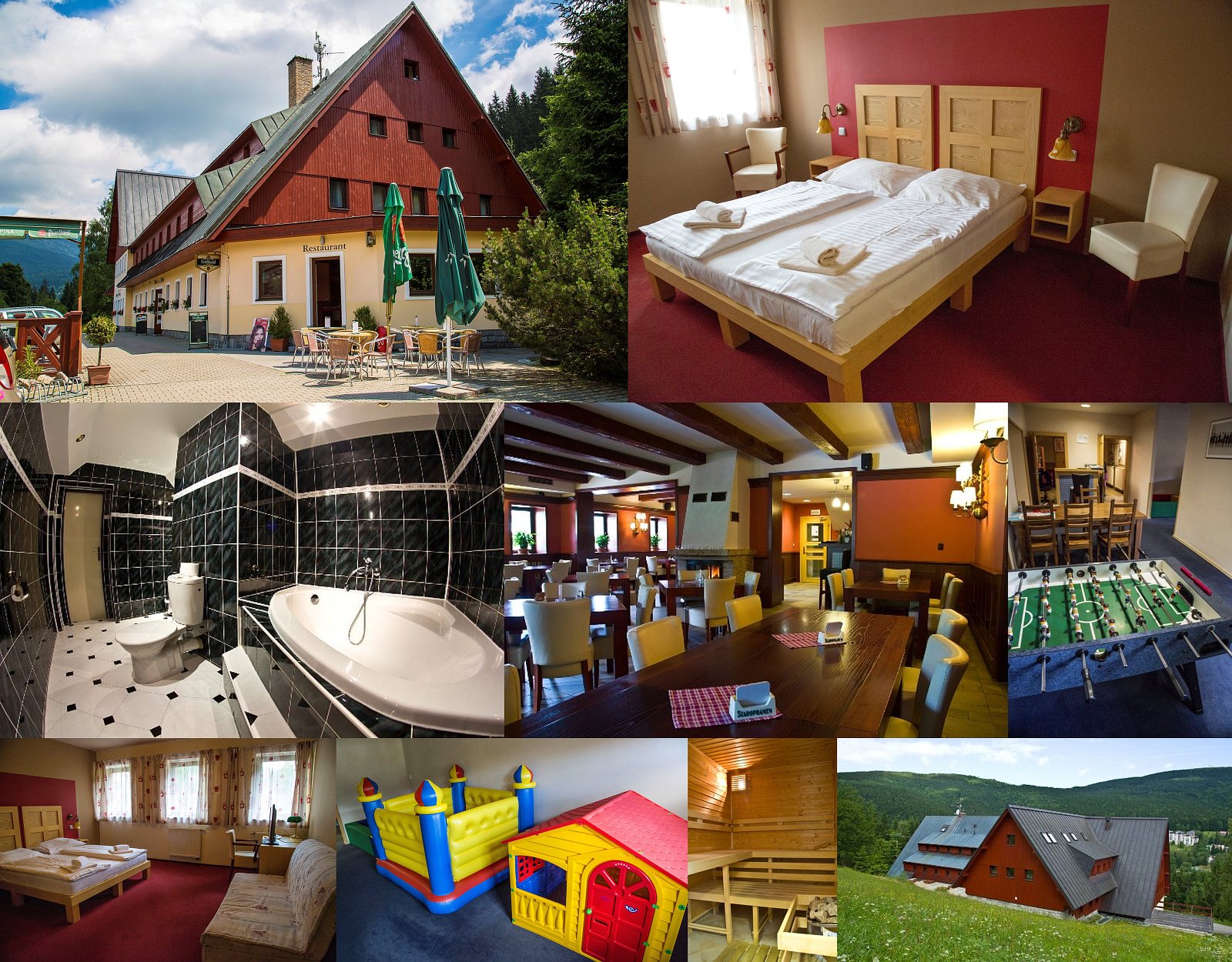 Ubytovanie: Hotel v roce 2004 zrekonstruovaný. Pokoje 1- až 4-lůžkové s vlastním soc. zařízením a TV+SAT. Pro rodiny dva apartmány s vlastní kompletně vybavenou kuchyňkou. Restaurace s krbem (80 míst), letní terasa s úžasným výhledem na Špindl a na Medvědín. K relaxaci hostů je v hotelu sauna, fitnes a v zimě i whirpool. Biliard, fotbálek. Lyžárna a úschovna kol. V celém hotelu je WI-FI zdarma. Vlastní parkoviště v letní sezóně, v zimě u sjezdovky Hromovka (dovoz hostů na skůtrech).