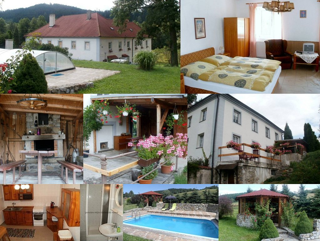 Ubytovanie: Penzion v romantickém prostředí zrekonstruovaného mlýnského stavení z 16. století. Penzion má kapacitu 18 lůžek ve 2- až 4-lůžkových pokojích s možností přistýlky. Dva pokoje jsou bezbariérové. Každý pokoj má vlastní sociální zařízení a varnou konvici. Na každém patře je lednice. Společná je kuchyň (sporák, mikrovlnka, varná konvice, toustovač, nádobí), terasa, venkovní krb, zastřešený bazén, trampolína, stolní tenis, místnost pro úschovu kol. V penzionu je wifi. Možnost zapůjčení dětské postýlky. Možnost ubytování s domácím mazlíčkem. Možnost snídaní.