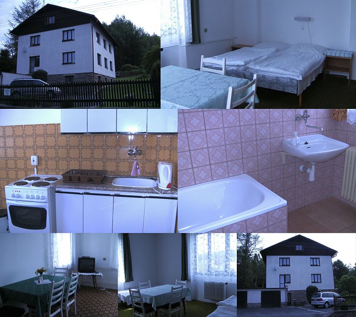 Ubytovanie: Penzion s kapacitou 15 lůžek ve 4 velkých a světlých pokojích. Tři pokoje mají umyvadla na pokojích a společné soc. zařízení, čtvrtý pokoj je s vlastní koupelnou a kuchyňským koutem. Společná kuchyňka (el. sporák, 2x lednice, nádobí) s jídelnou, posezením a TV. Zahradní posezení. Parkování přímo před penzionem, kola uschováme v penzionu. Ubytování s pejskem je možné.