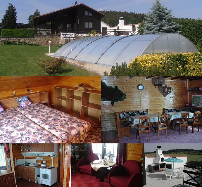 Ubytovanie: Chata s 12 lůžky, celá k dispozici jen klientům, včetně zahrady s okrasnými keři a zastřešeného bazénu. Kompletně vybavená kuchyň (el. sporák, mikrovlnka, lednice s mrazničkou, rychlovarná konvice, kávovar, toustovač), velká jídelna s TV+SAT. Krytá terasa se zahr. nábytkem, houpačkou a koupelnou s WC. Velká ložnice se 4 lůžky, koupelna a WC. Ve sníženém podkroví 2 ložnice (2+4 lůžka) a spol. místnost (TV+SAT, DVD, radiomagnetofon+CD). Otevřená terasa s krbem a udírnou. Dětská postýlka, chodítko, stoleček, vanička. Bazén je v provozu v měsících 05-09.