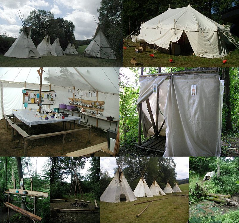 Ubytovanie: Klasická táborová základna s ubytováním v 10 tee-pee (indiánské stany). V tábořišti je šapitó (kuchyň, jídelna), polní umývárna, polní sprcha, suché WC, initipi (indiánská sauna). Na tábořišti není el. proud, teplá ani pitná voda (ta se dováží z obchodu cca 1,5 km - k dispozici barely na 360 l). Kuchyň je vybavena plynovými kamny, kamny na dřevo, 2 kotly na vaření, kotlem na ohřev vody, nádobím na vaření pro 40 osob, uzamykatelnými bednami na potraviny.