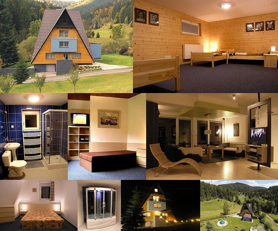 Ubytovanie: Vila se 4 apartmány, obklopená velkou zahradou s vlastním rybníkem a letním vyhřívaným bazénem. K dispozici WiFi, možnost zapůjčení TV. Před domem je vlastní lyžařský vlek s osvětlenou sjezdovkou (délka 150 m, při příznivých sněhových podmínkách je hostům k dispozici zdarma), možné také večerní lyžování, sáňkování či bobování. Apartmá Tourist (4 lůžka): bez kuchyňky, spací část oddělená závěsem, koupelna. Apartmá Standard Plus (4 lůžka): obývací pokoj s kuchyňkou, ložnice, koupelna. Apartmá Elegance (5 lůžek): obývací pokoj s kuchyňkou, dvě ložnice, koupelna vybavená parní lázní. Apartmá Luxus (7 lůžek): nejkomfortnější, v přízemí s přímým vstupem do zahrady, kuchyň (vč. myčky a americké lednice), jídelna, obývací místnost s prosklenou stěnou, krbem a akváriem, dvě ložnice, koupelna.