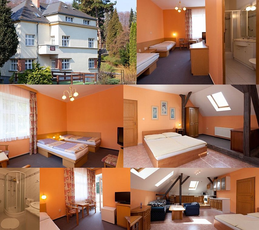 Ubytovanie: Vila v prvorepublikovém stylu s 12 zrekonstruovanými pokoji s vlastním soc. zařízením a lednicí (pokoje 1x1, 11x2 lůžka). Ve vile je také 4-lůžkový kompletně zařízený apartmán s kuchyňkou. Možnost masáží a ostatních lázeňských léčebných programů. Ve vile je útulná kavárna, v letních měsících venkovní terasa. Možnost snídaní.